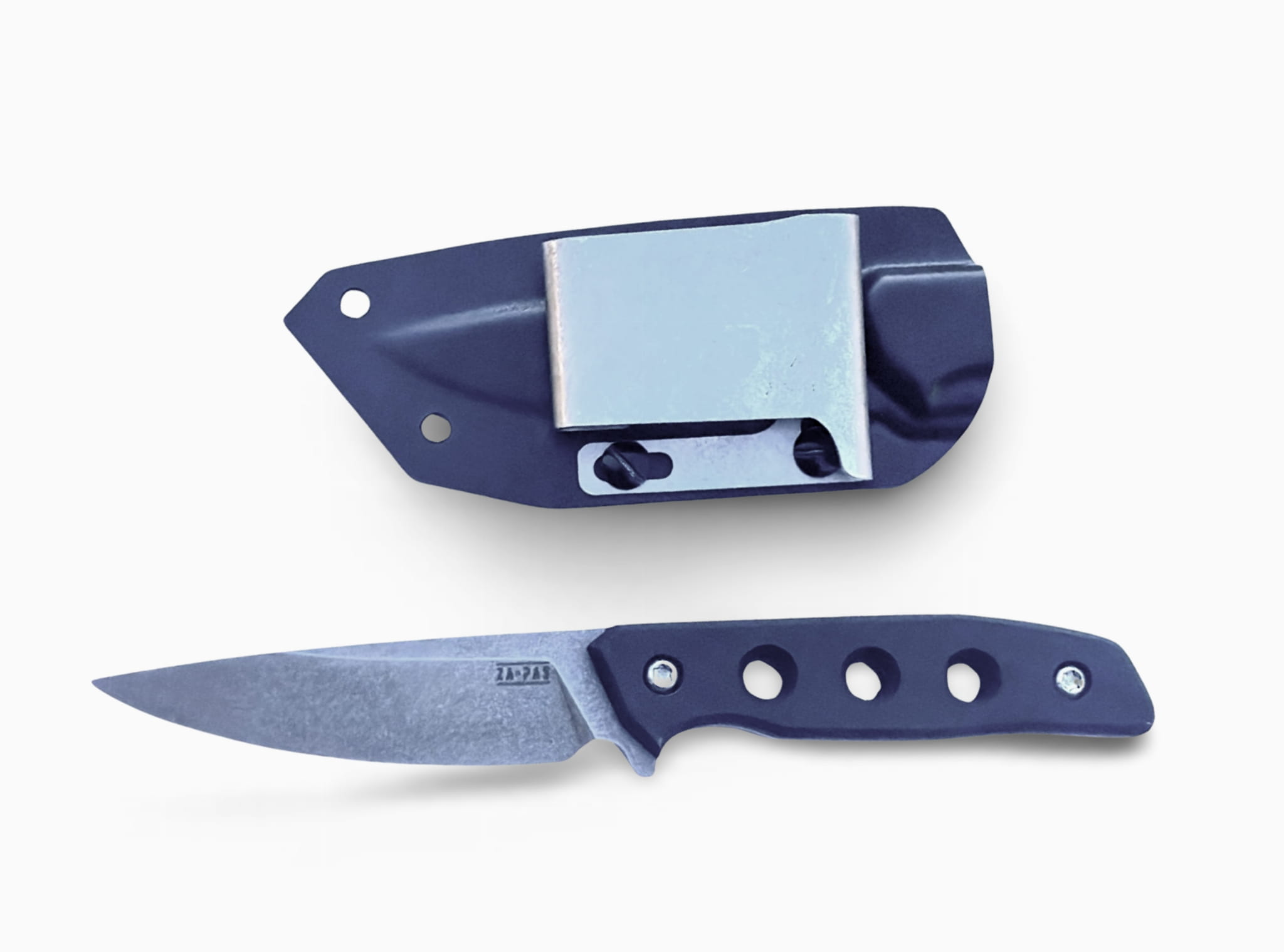 Kydex sheath - can be mounted vertically and horizontally thanks to the stainless steel handle we designed. The holes are spaced in such a way that it is possible to install a "Tek-Lok" handle.