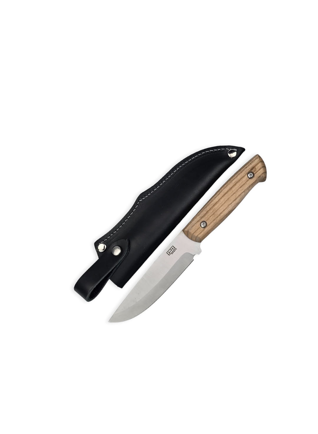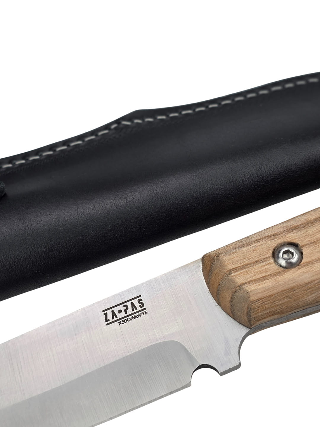 The knife has a flat-ground blade with a working drop point profile, extremely versatile in use. The blade material is X50CrMoV15 (1.4116) stainless steel tool steel, which contains alloy additions such as Manganese and Vanadium, which are responsible for increased abrasion resistance hardened to 57-59 HRC.