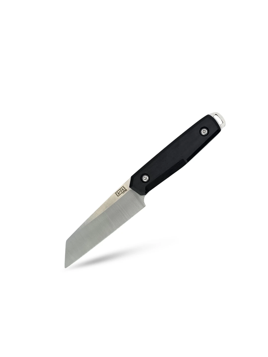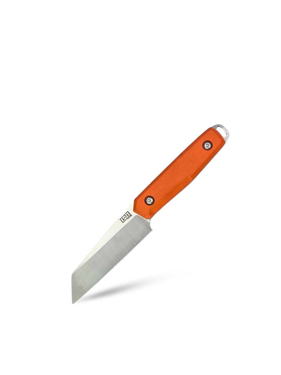 The knife features a flat-ground Wharncliffe blade with a straight cutting edge, providing excellent control and high precision during cutting tasks.