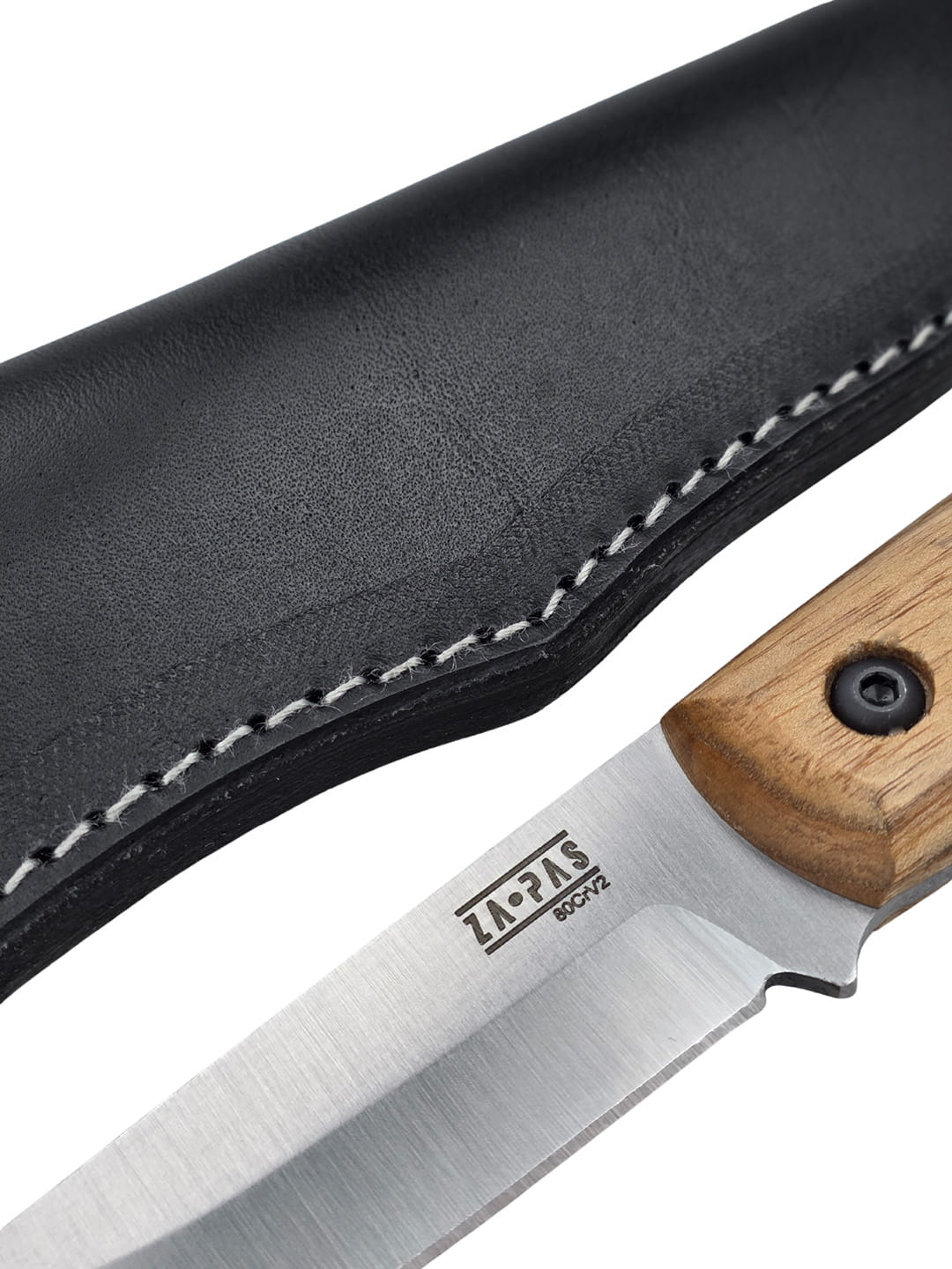 The knife features a flat-ground drop point blade, making it highly versatile in use. The blade is made from 80CrV2 tool steel — a carbon steel containing alloying elements such as manganese and vanadium, which provide increased wear resistance and excellent toughness.