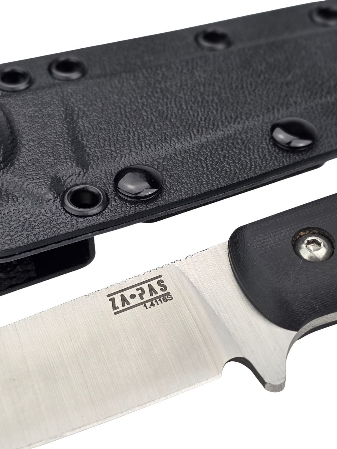 This steel should not be confused with the popular 1.4116 (X50CrMoV15). The steel used in this model contains alloying elements such as vanadium, molybdenum, and nitrogen, allowing it to reach a hardness of 59–61 HRC after heat treatment. In practice, it offers properties comparable to the popular stainless steel Sandvik 14C28N. The high grind and thin cutting edge provide excellent cutting performance while remaining easy to sharpen.