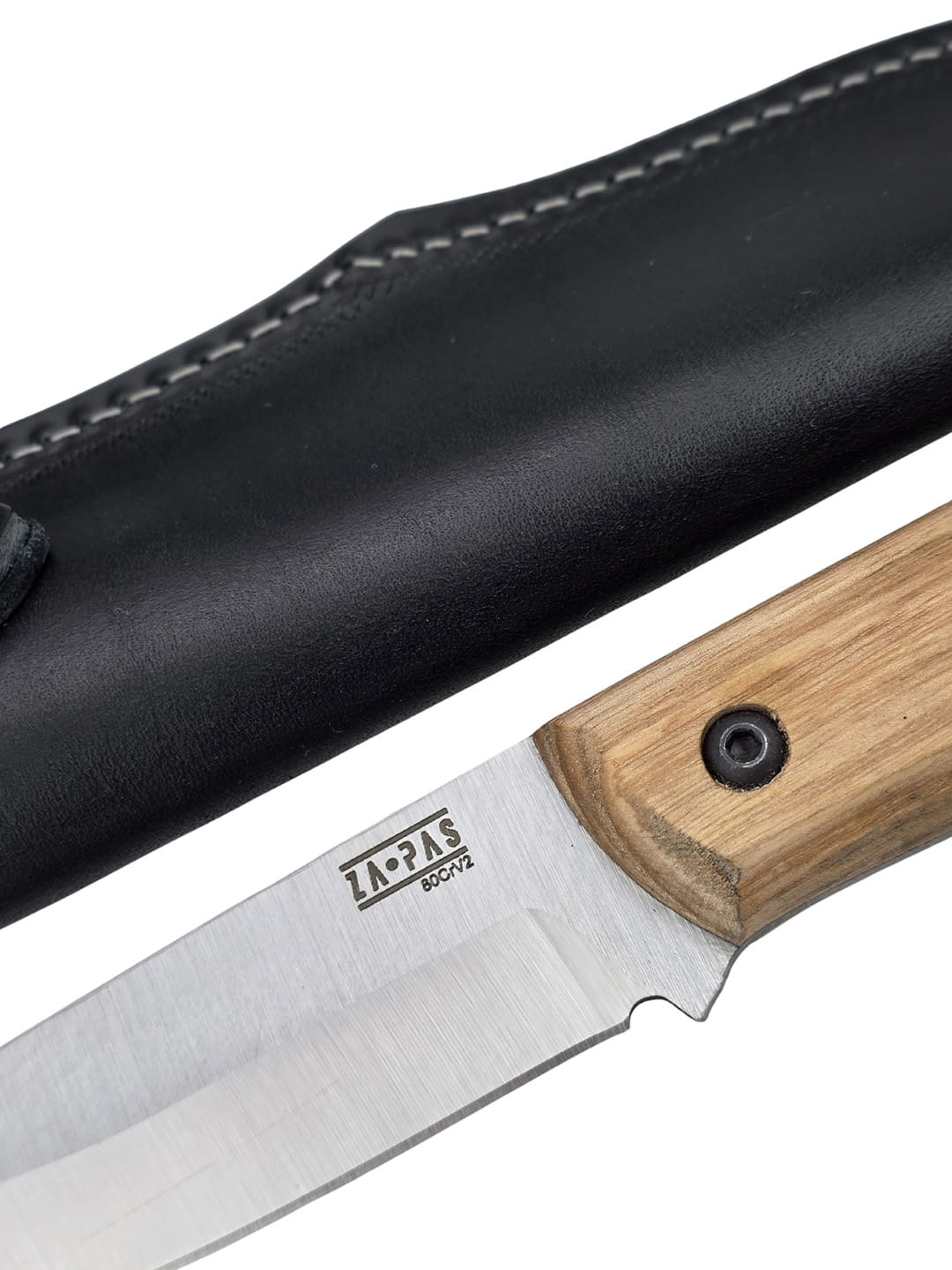 The knife features a flat-ground drop point blade, making it highly versatile in use. The blade is made from 80CrV2 tool steel — a carbon steel containing alloying elements such as manganese and vanadium, which enhance wear resistance and provide excellent toughness.