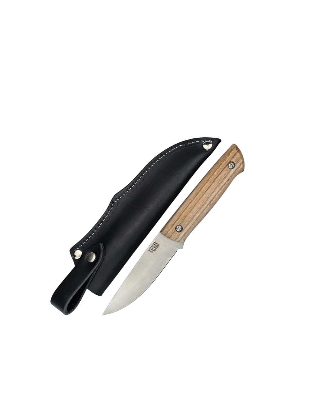 The knife features a flat-ground drop point blade, making it highly versatile in use. The blade is made from X50CrMoV15 stainless tool steel, offering very good corrosion resistance and solid edge retention.