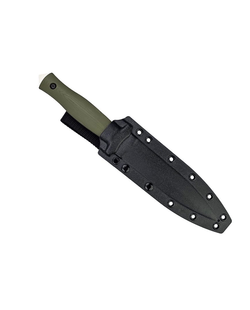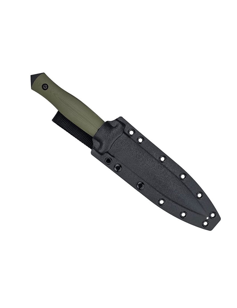 The handle scales are made from durable G10 composite in olive green. The scales fit tightly to the full-tang construction and are secured with black screws.