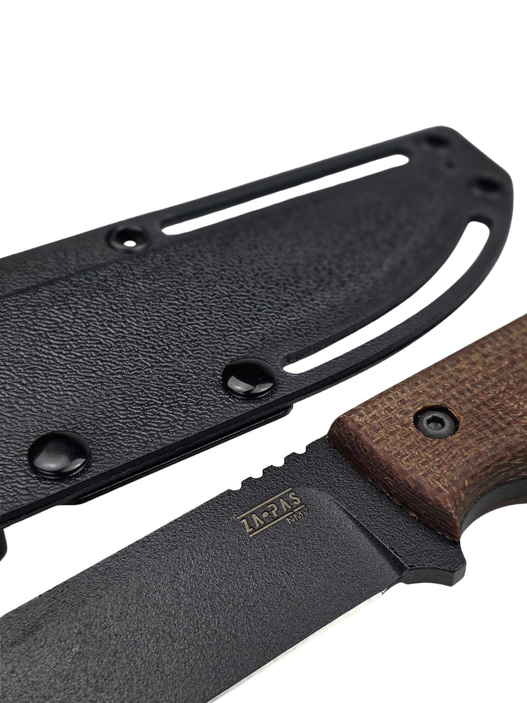 The scales are fastened to the knife with black screws, ensuring stability and durability during intensive use.